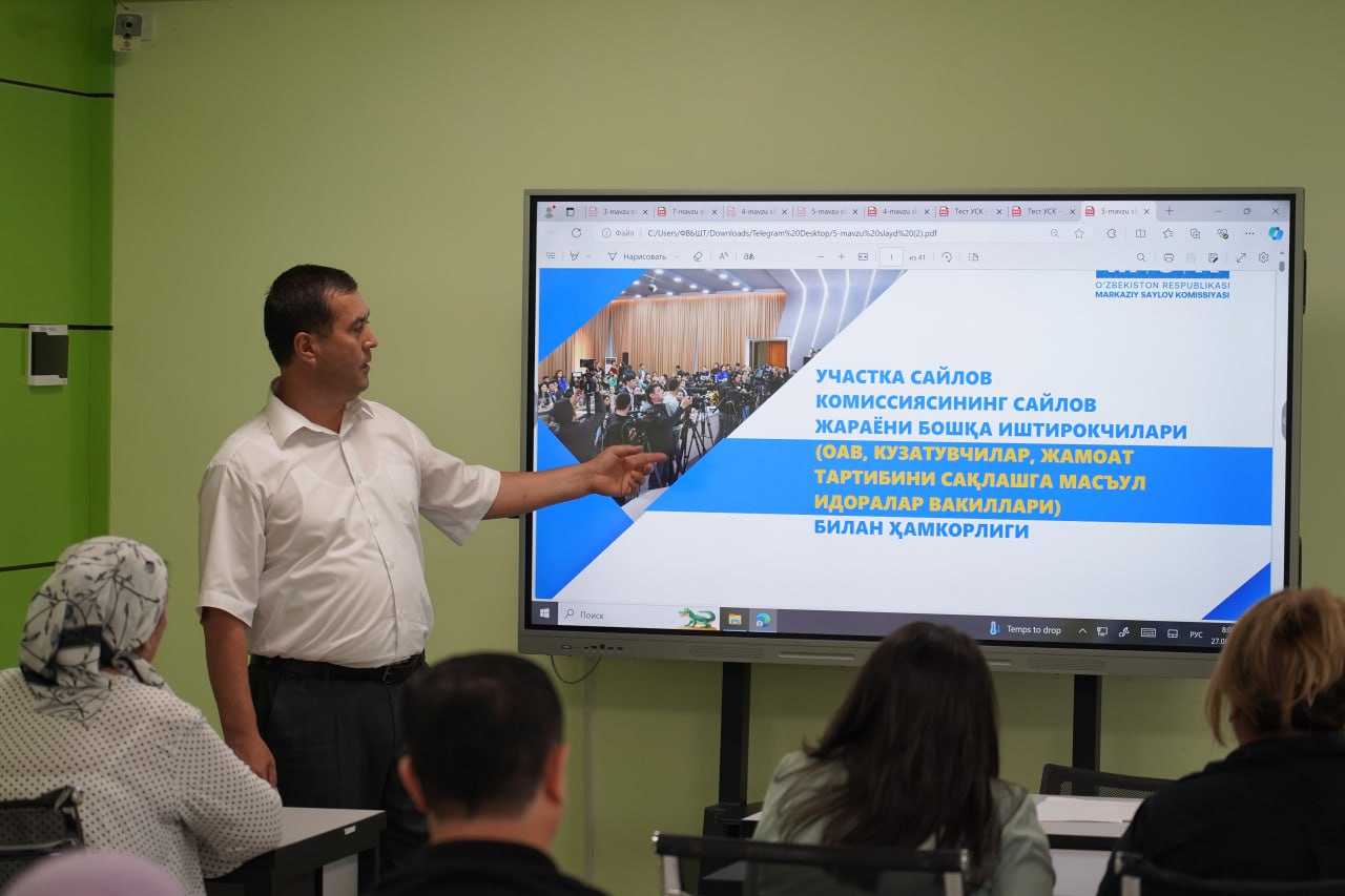 ўқув-машғулотларида тренерлар томонидан сайлов тизимига киритилган ўзгаришлар, аралаш сайлов тизимининг моҳияти ва ўзига хос хусусиятлари, сайлов комиссиялари фаолиятининг асосий жиҳатлари, сайловчилар рўйхатини шакллантириш ва ушбу рўйхатлар билан ишлашда сайлов комиссиялари олдида турган вазифалар, сайлов комиссиялари бинолари ва овоз бериш хоналарини жиҳозлашга қўйилган талаблар, муддатидан олдин овоз беришни ташкил этиш, овоз бериш кунига тайёргарлик бўйича батафсил тушунча ва маълумотлар берилмоқда.